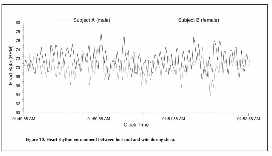 下のグラフはある夫婦の寝ている間の心拍数の推移比較。心拍数の波形がシンクロしているのが分かる。