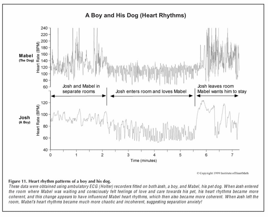 シンクロするのは人間だけではない。ペットと飼い主の心臓のリズムもシンクロするという。下のグラフにあるように、同じ部屋にいるときに、心臓のリズムが見事にシンクロしている。