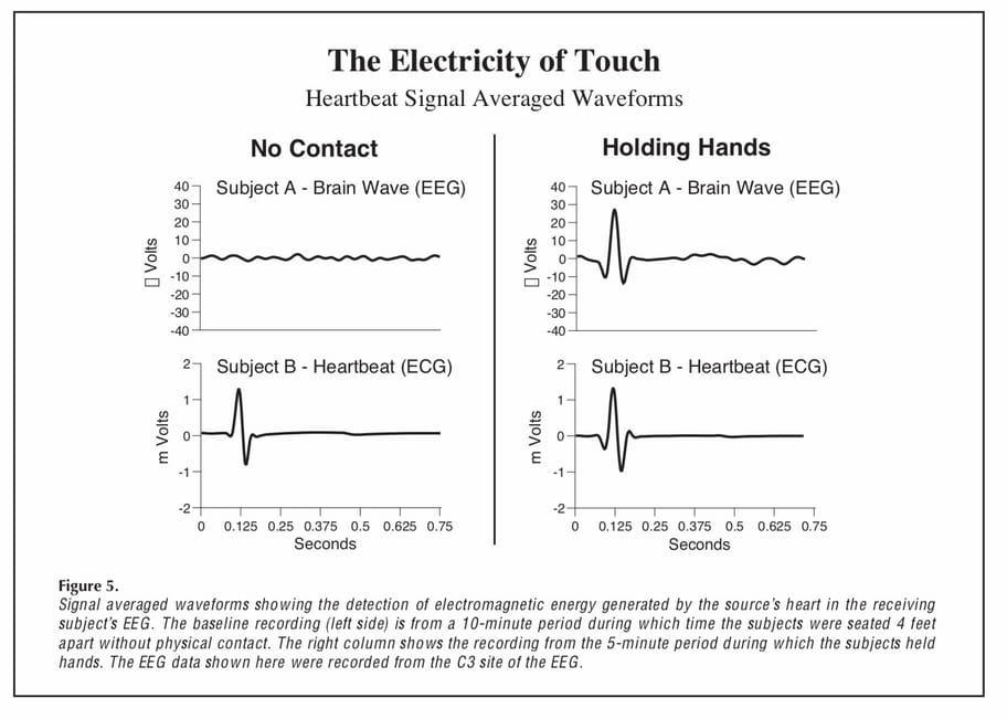 論文によると、心臓は体の中で最も大きな電磁場を形成しており、心電図で測ることのできる電磁波の振り幅では、脳波計で計測できる脳波の振り幅の60倍にもなるという。また心臓の発する磁場成分の強さは脳が発する磁場成分の5000倍もあり、細胞組織に邪魔されることなく、1~2m離れた場所でも計測が可能だという。
