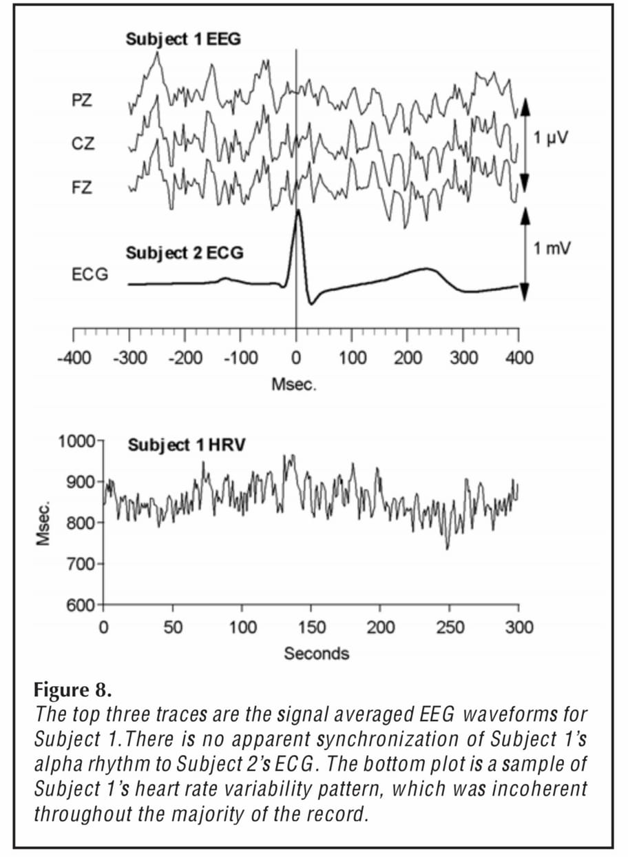 Figure 8の下のグラフは、別の被験者の心電図。この波形から見て、この被験者の心拍は安定していないという。上のグラフはこの被験者の心電図の波形と、近くにいる別の被験者の脳波の波形の比較。まったくシンクロしていない。